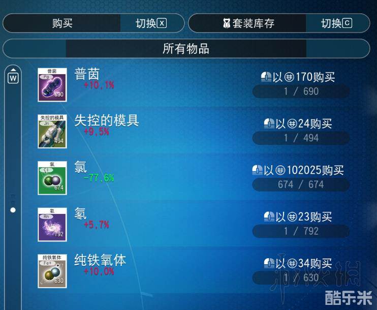 (3)这时候氯会大幅度降价,一般直接打了三折到二五折!直接切到购买选项这五六千单位的氯,再连同终端里面本来就卖的几百一千多单位的氯全部买走.于是你的氯在原来的基础上增加了几百个单位,还白赚了几百万.(我这张图上面当时已经吧一万多单位的氯重新买走了,剩下的就是本来里面就有卖的氯)