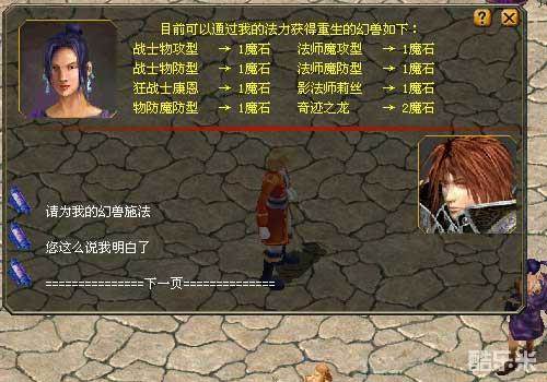 然而,在孵化初生幻兽的过程中,难免会出现少数属性平庸的幻兽,它们往往只能被随手丢弃或者深藏仓库中,难免有些暴殄天物。这时候,您就可以将这些幻兽交给卡诺萨市场的格丽(357,455),使用一些魔石,即可重新换取一枚同种类的幻兽蛋,来进行新一轮的培育,让宝贵的幻兽又有一次重生的机会!