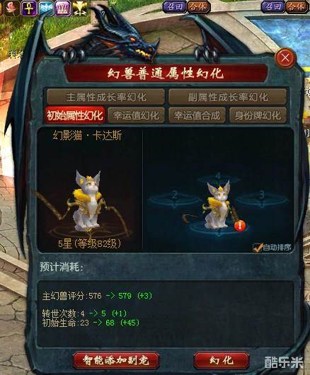 ◆ 初始值幻化需要两只符合条件的幻兽。主幻兽的等级需要达到 70(主人也需要达到70级),副幻兽达到40级即可(副幻兽至少要有一项初始属性数值高于主幻兽)。