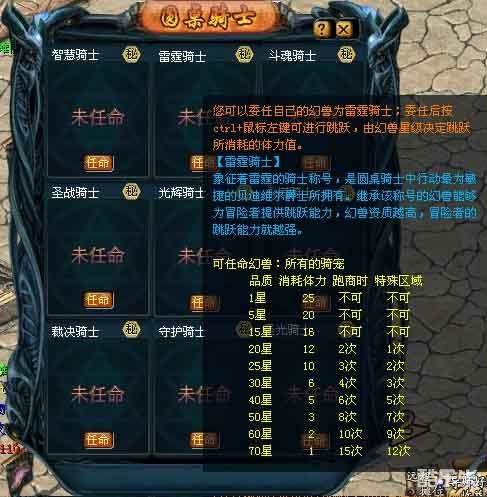 所有骑宠都可以任命为雷霆骑士,根据星级进行跳跃时候所消耗的体力值也有所不同,因此跳跃次数也会有所差别(一般状态下正常体力值为100,有神之祝福时为150)。