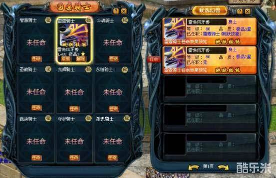 点击“圆桌骑士”界面的“任命”按钮,屏幕右侧出现“雷霆骑士”的候选幻兽页面,你根据幻兽任命的效果选择你想到任命的幻兽。