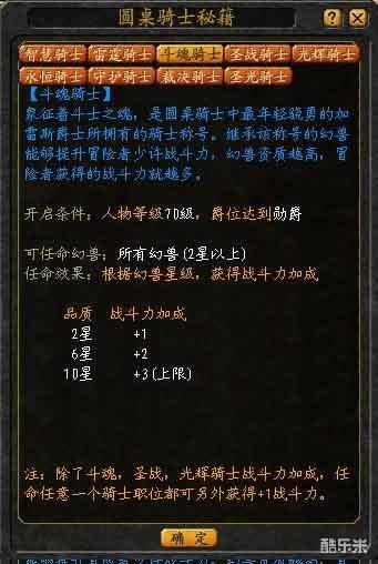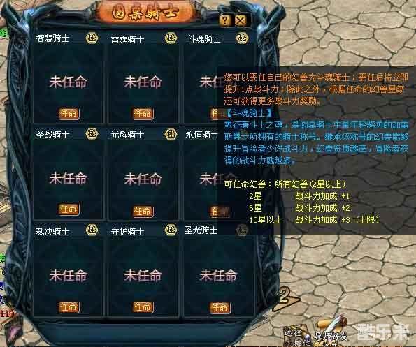 任命“斗魂骑士”后,能马上获得1点战斗力提升;同时根据幻兽星级可获得相应的战斗力加成。