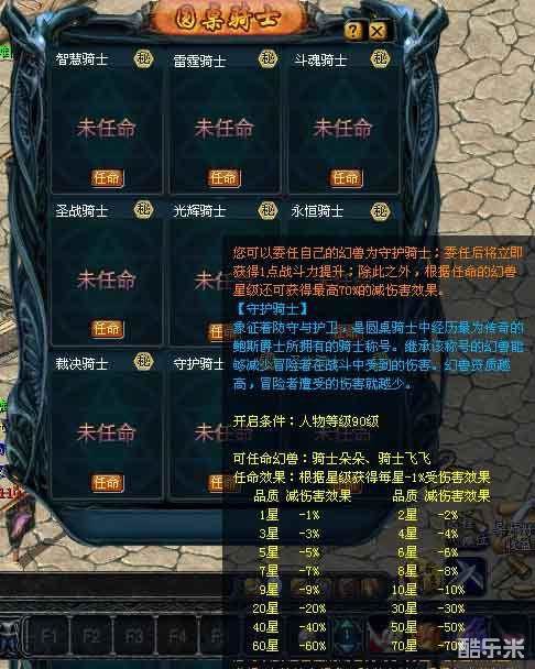 任命“守护骑士”后,能马上获得1点战斗力提升;除此之外,根据任命的幻兽星级还可获得最高70%的减伤害效果。