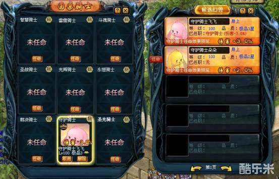 点击“圆桌骑士”界面的“任命”按钮,屏幕右侧出现“守护骑士”的候选幻兽页面,你根据幻兽任命的效果选择你想到任命的幻兽。