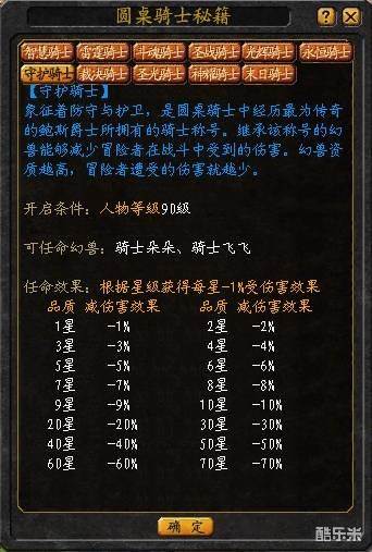 1星的“守护骑士”可以减少1%的伤害值,每增加1星可以减少1%伤害,最高可以获得70%的减伤害效果(幻兽星级达到或者超过70星时)