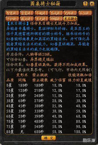 任命“末日骑士”后,并不能获得战斗力的加成;但是根据幻兽星级可获得不同的技能效果,如变形术、禁止骑乘、禁止跳跃、体力回复减慢等等。同时在任命“末日骑士”并且瑞拉的星级达到5星后,就能学会飞行技能,成功驾驭异能之翼。详情请看下方的末日骑士秘籍。