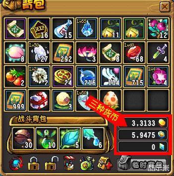 打开背包,可以快速查看拥有的三种货币状况,如下图所示,从上到下依次是金币、代用金、水晶币:
