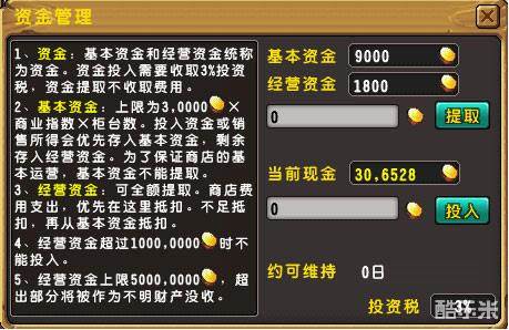 商店维护:商店每天0:00维护一次,维护需要消耗一定金钱,请保证你的商店中预存有一定的费用。在资金管理界面输入预存数量点【投入】即可;
