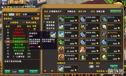 点击 商会管理人 >> 我要买 ,将打开商店列表,双击某间商店,即可打开该商店选购物品。商店界面中,左边为柜台,右边为可选购的商品,点选物品填好数量后点【购买】即可买下此商品。