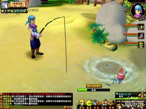 寻找鱼洞:鱼儿分布在精灵世界的各个河流水域中,聚集的地方将产生鱼洞,找到鱼洞就可以开始钓鱼了,鼠标放在鱼洞上可以看到这里出产几级的鱼。