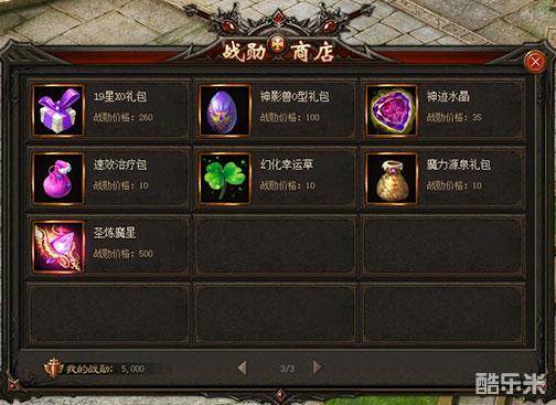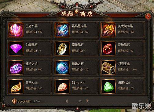 战勋可以在战勋商店中兑换王者水晶、月光宝盒、神祈之泪等各类宝石、各式副宠、霜焰/炙龙武器幻魂碎片,品类齐全应有尽有!战勋商店可通过军团或家族界面开启。