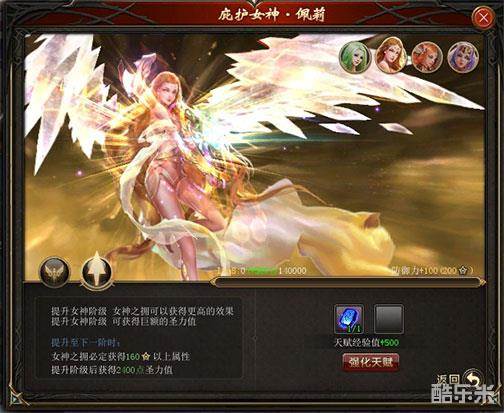 女神圣阶初始等级为1阶,最高为10阶,通过使用1阶~6阶天赋经验石,可提升女神圣阶经验值。当前等级经验值封顶后,使用1阶~6阶天赋进阶石可获得女神圣阶的提升。提升圣阶的同时,将获得大量的圣力值加成。