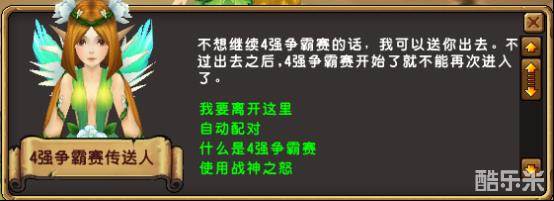 每场战斗结束都将计算积分,每个职业的积分总和为本职业四强赛积分,积分落后的职业可以在NPC处领取一个能够增强战斗力的buff‘战神之怒’,短时间内提升战斗力。其余三个职业的玩家均被击败出场时,比赛提前结束,获得积分最高的职业获胜。比赛结束时,若仍然有玩家在进行战斗,系统将强制结束所有战斗。