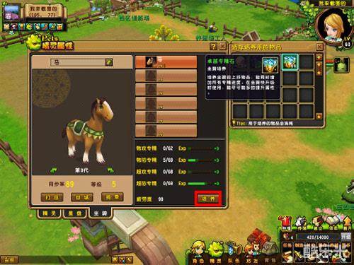 点击坐骑界面右下方的【培养】按钮,将打开“选择培育品”界面。在这里你可以选择适合的物品“喂养”宝马。