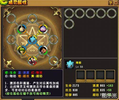 如下图中,加林球和海胆的蓝色连了起来,所以这两只精灵都获得了速度的加成,可以在图中右下角的属性中看到,海胆的速度增加了102。精灵连接了颜色的那项能力越强,加成的数值越高。