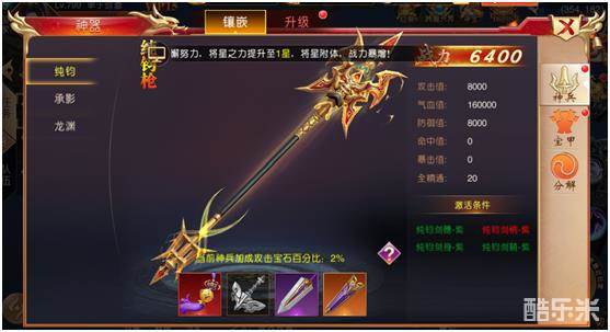 4.激活神兵宝甲会对角色镶嵌的宝石造成百分比加成,激活的数量越多,等级越高,加成的百分比越高。