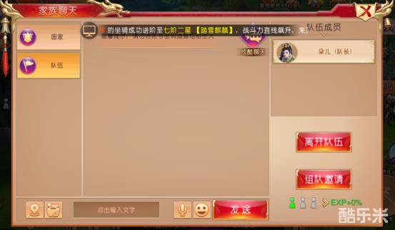 聊天频道中有“世界”“国家”“答题”“队伍”“家族”“系统”六个频道。