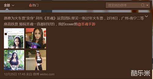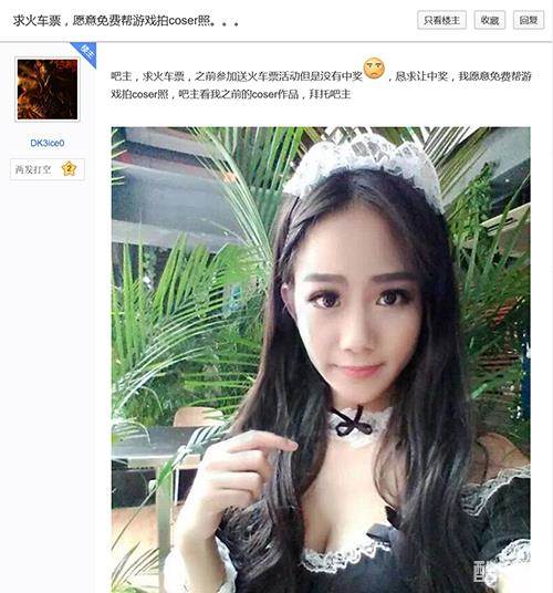 “ DK3ice0”重新开贴,贴出自己的美照,表示愿意为游戏拍cos宣传照,更主动发微博为游戏活动做宣传,博得《圣魂》手游活动发起者的同情,愿意为她开特例,帮她买火车票。