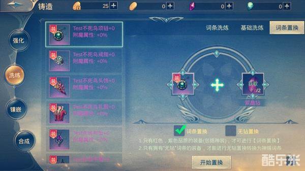 1、消耗红晶钻或紫晶钻对红色或紫色装备进行词条置换
