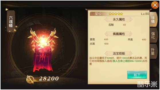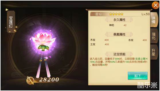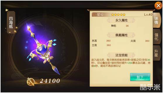 法宝技能触发后带来的1200的暴击以及闪避加成,相信不需要小编多说了,攻守兼备的法宝,你值得拥有。