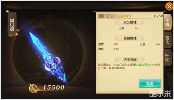 虽然幽月剑只是一件蓝装法宝,战力对比其他5星和6星的法宝相差也较多,但是幽月剑强势之处在于它的法宝技能,50%几率附加4%目标生命值上限的绝对伤害,特别是面对夸父这种坦克类的角色,幽月剑的效果就显得更加明显了。