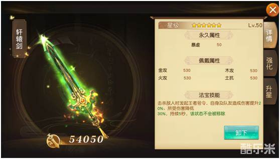 50点的永久暴虐属性可以说是目前法宝当中最高之一了,满星满强化的轩辕剑战力对比其他5星的法宝高出了将近一半。