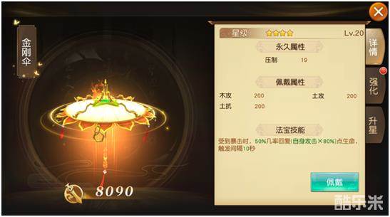 虽然金刚伞只是一件蓝装法宝,战力看上去可能并不是那么突出,但是金刚伞强势之处在于它的法宝技能,受到暴击时,50%几率回复(自身攻击×80%)点生命,特别是面对魍魉这种暴击爆发高的角色,金刚伞的效果就显得更加明显了。