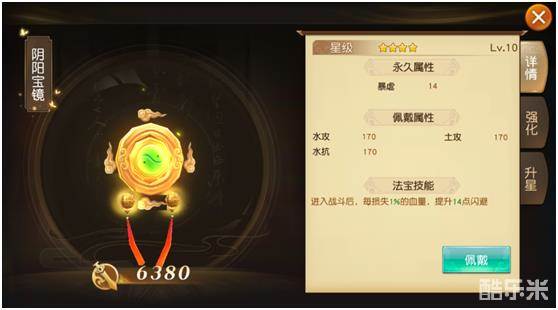进入战斗后,每损失1%的血量,提升14点闪避,阴阳宝镜对夸父的提升也是简单明了,显而易见的,在高闪避的基础下,适当提升下自身的命中率,在PVP模式中就能借助这种伤害差来打出自身的输出。