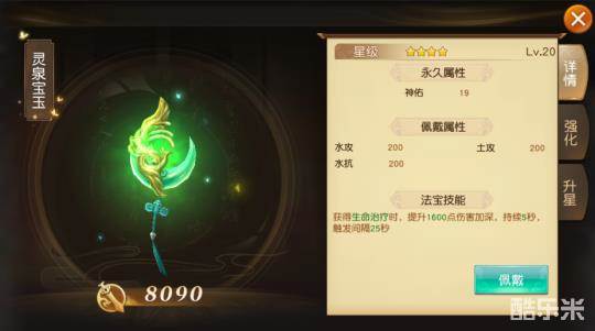 灵泉宝玉是一件和司命相生相依的装备,法宝触发的唯一条件就是获得生命治疗,灵泉宝玉不但适合司命哦,如果在组队的状态下,队友只要佩戴了灵泉宝玉,在司命的治疗效果下也可以触发到伤害加深的效果哦。