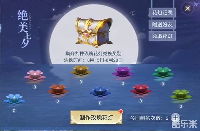浪漫七夕,怎能少了花灯相伴?“绝美七夕”活动中,天命者们每天都可以领取漂亮的玫瑰花灯。收集不同种类的花灯获取奖励,还能把它们送给心上人,一起完成花灯收集,共渡温馨浪漫的七夕佳节!