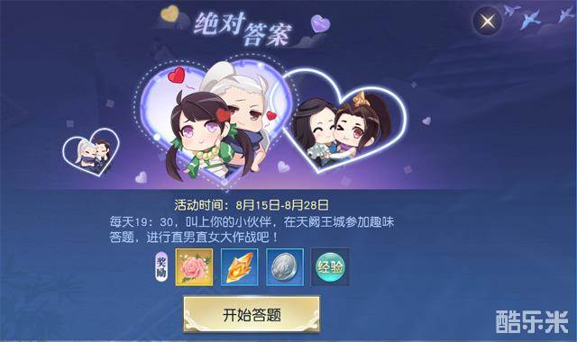 此外,每天晚上19点,天命者们还能携手前往天阙王城,一起参参与“绝对答案”活动!谁是直男直女?开动脑筋、挑战趣味问答,与心上人一起享受快乐的温馨时光吧!