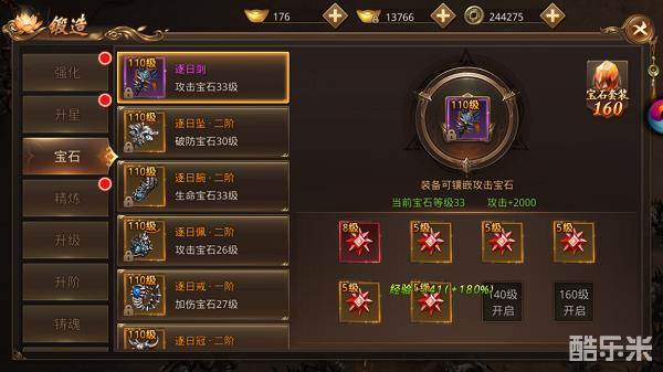 宝石系统,我们的装备不仅仅能够强化还需要进行宝石的镶嵌。每一件装备在游戏中可以镶嵌八块宝石,不同的宝石位置,在我们等级达到相应要求的时候才能开启,而在游戏中不同的装备在游戏中可以镶嵌不同的宝石,宝石的等级越高,给我们带来的战斗力加成也就越高。装备可以镶嵌宝石也可以将宝石取下。在游戏中180级的时候才能够镶嵌满宝石,第八块宝石需要160级的时候才会开启。人物达到160级的时候,我们的装备才会出现最终的形态和属性。