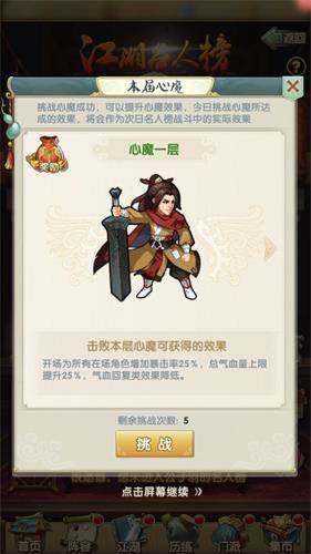 如前文中提到的,其实《大掌门2》江湖名人榜里的挑战心魔就是和自己对抗,确切的说是和前一天最高战力的自己打。心魔分为5层,前1-2层心魔的战斗力还是比较容易被掌门攻克,也并没有特别的属性加成。进入第3层和第4层,心魔的战斗力已经增强了许多,若掌门依旧用前一日的布阵方式和战斗力去对抗,那么就要小心在第3层受挫了!