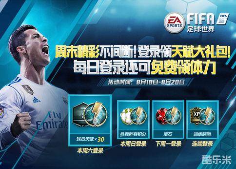 1、本周六(8月18日)登录《FIFA足球世界》即可获得:球员天赋x30;体力x30