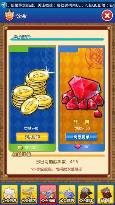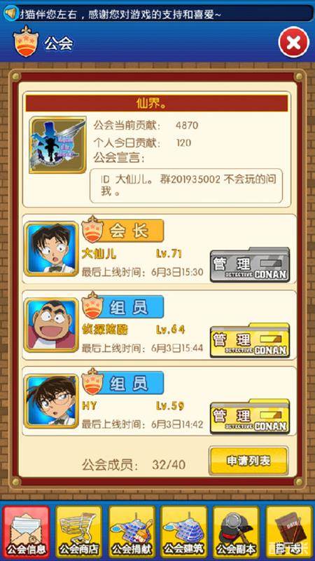 一个篱笆三个桩,一个好汉三个帮,作为《名侦探柯南OL》六月份重磅推出的公会系统,游戏的公会管理上自然不能只由会长一个人忙不停。公会有职务划分为会长、组长与组员。一个公会只有一个会长,会长的权利最大,同意入会申请、提拔组长、取缔组长、踢出组员以及建筑升级;而副会长则是由会长提拔上来的组长,总人数共2人,组长享有通过入会申请、踢出组员以及建筑升级的权利。玩家可以花费钻石或金币进行公会捐献,提升贡献值,帮助公会升级,在上下一心的优质管理中,一同打造最强侦探团!