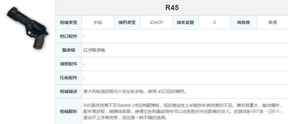 R45 将会是一把比较实用的手枪,伤害应该也不低。在刚开始降落的时候我们可以拿来使用。R45虽然伤害不及霰弹枪,但在稳定性上却能弥补其伤害的不足。配件易获取,换弹效率高,使得它在刺激战场中可以出色胜任中近距离的交火。在游戏前期装备一把R45,虽谈不上非常优秀,但也是一种不错的选择。