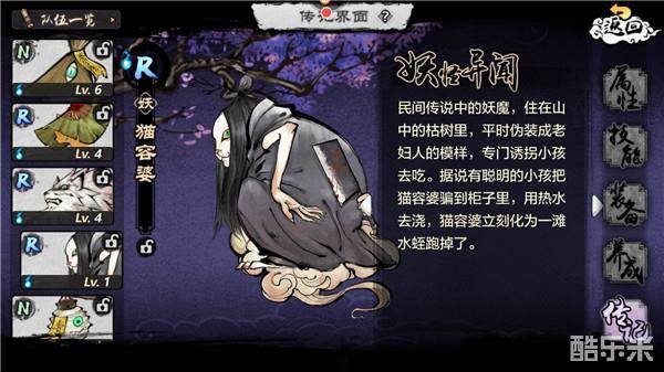 游戏的大部分角色都是来自民间妖怪,比如《山海经》、《聊斋志异》什么的,登场妖怪比较多,而且都有各自的特点。比较让我意外的是游戏并没有为了迎合大家的品味而对妖怪进行萌化,里面一些怪物的造型真的吓到我了(比如那个拿着柴刀的猫容婆)。每个妖怪都有各自的妖怪异闻,可以让各位充分了解妖怪的典故。不过有极少部分的妖怪外观区别不大,因此扣两分。