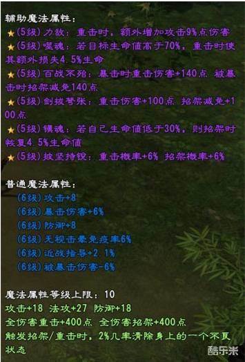 新装备护心镜与披风的属性类似,拥有“初始属性”以及“魔法属性”。初始属性是指每一个护心镜都会拥有的战斗属性。即“重击”和“招架”。魔法属性则是由护心镜的品质来决定,最极品的护心镜能拥有12条魔法属性。