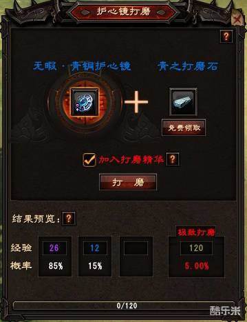 4)护心镜进行打磨时,还可同时放入打磨精华,可大幅提高打磨获得的经验,不同打磨石需要的打磨精华不一样。