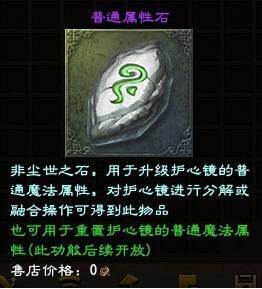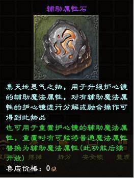 属性石除了用于升级魔法属性,还可重置护心镜上对应类型的属性,并且使用辅助属性石重置时有可能将普通魔法属性重置为辅助魔法属性。