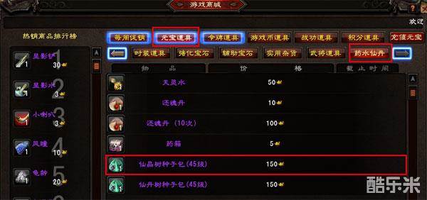 1.在商城-元宝道具-药水仙丹 中,购买仙晶树种子包: