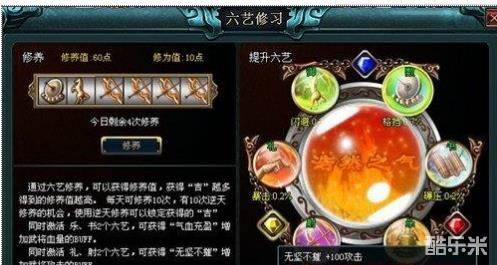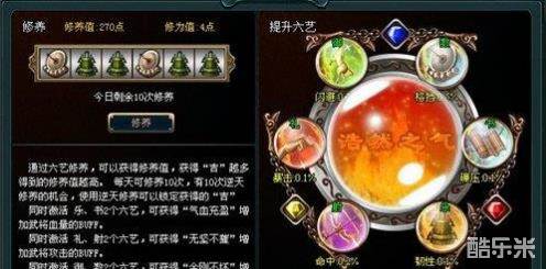 获得修养值后,玩家可以将获得的修养值灌注到六艺系统中,成功灌注一次会随机增加6个属性中的一个。