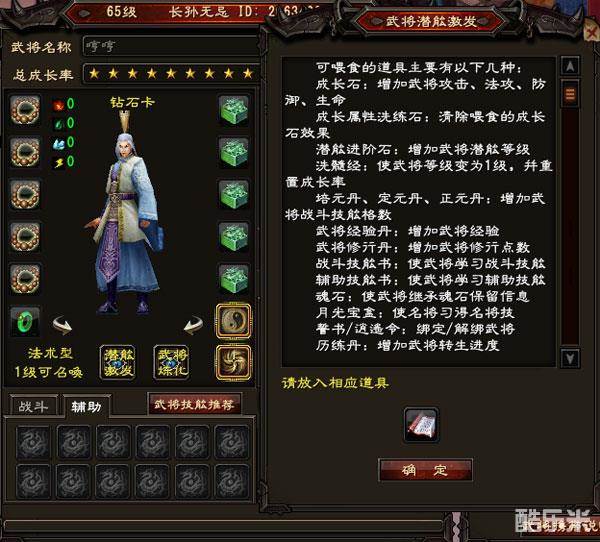 1.打开武将界面,点击潜能激发,放入1级辅助技能书: