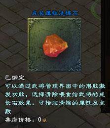 玩家可以使用成长属性洗练石来选择清除武将已使用潜能点的属性和点数,成长属性洗练石可以在商城-游戏币道具-武将道具中进行购买。