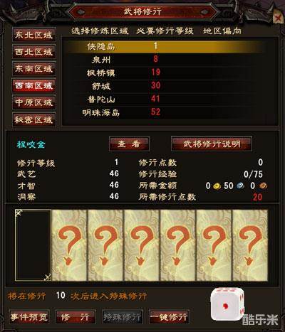 相关NPC:武将修行大师 洛阳(348,331) 或 长安(263,299)