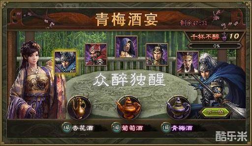 1、活动开启后可与武将对饮,每轮共5位武将,免费赠送3轮;