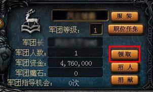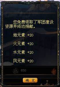 即日起,军团职位达到“资深团员”及以上的团员,每天可免费领取:地火水风元素资源各20点,可通过军团界面左下角的“领取”按钮使用该功能: