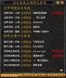 此外,所有玩家还可以通过与NPC扎卡德(308,443)的对话,查询目前家族领地的占领家族和接受挑战的情况。