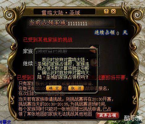 只有本家族的族长与家族占领的NPC对话,才可放弃占领的家族,放弃占领的时间为一个回合,即每天的21:00起到次日的20:30为止。