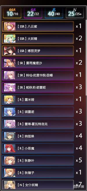 500抽R的概率变低了,5星老鼠打的钱不够抽SSR的,而2400抽SSR感觉变低了好多。打了两把N4 一把操作吧自己秀了,吃了个五星灵梦就没过,正常依然是6个五星。